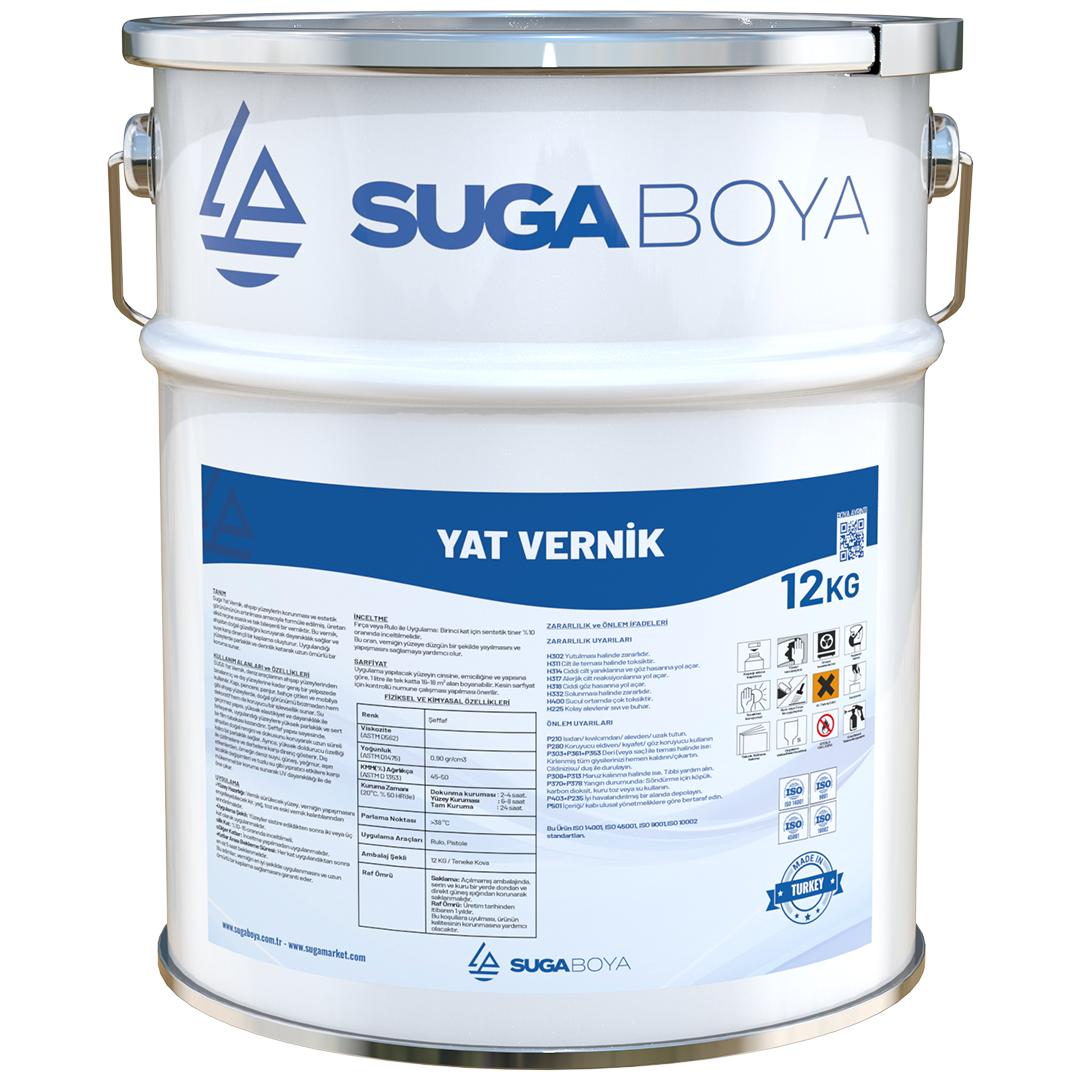 Suga Yat Vernik, özellikle deniz şartlarına dayanıklı olması gereken ahşap yüzeyler için geliştirilmiş, üretan alkid reçine esaslı, tek bileşenli ve yüksek performanslı bir verniktir. Yüksek parlaklık seviyesi, suya dayanıklılığı ve UV koruması sayesinde iç ve dış mekan ahşap yüzeylerde uzun ömürlü bir koruma sağlar. Ahşabın doğal görünümünü bozmadan dayanıklılığını artırır ve çizilmelere karşı güçlü bir film tabakası oluşturur.